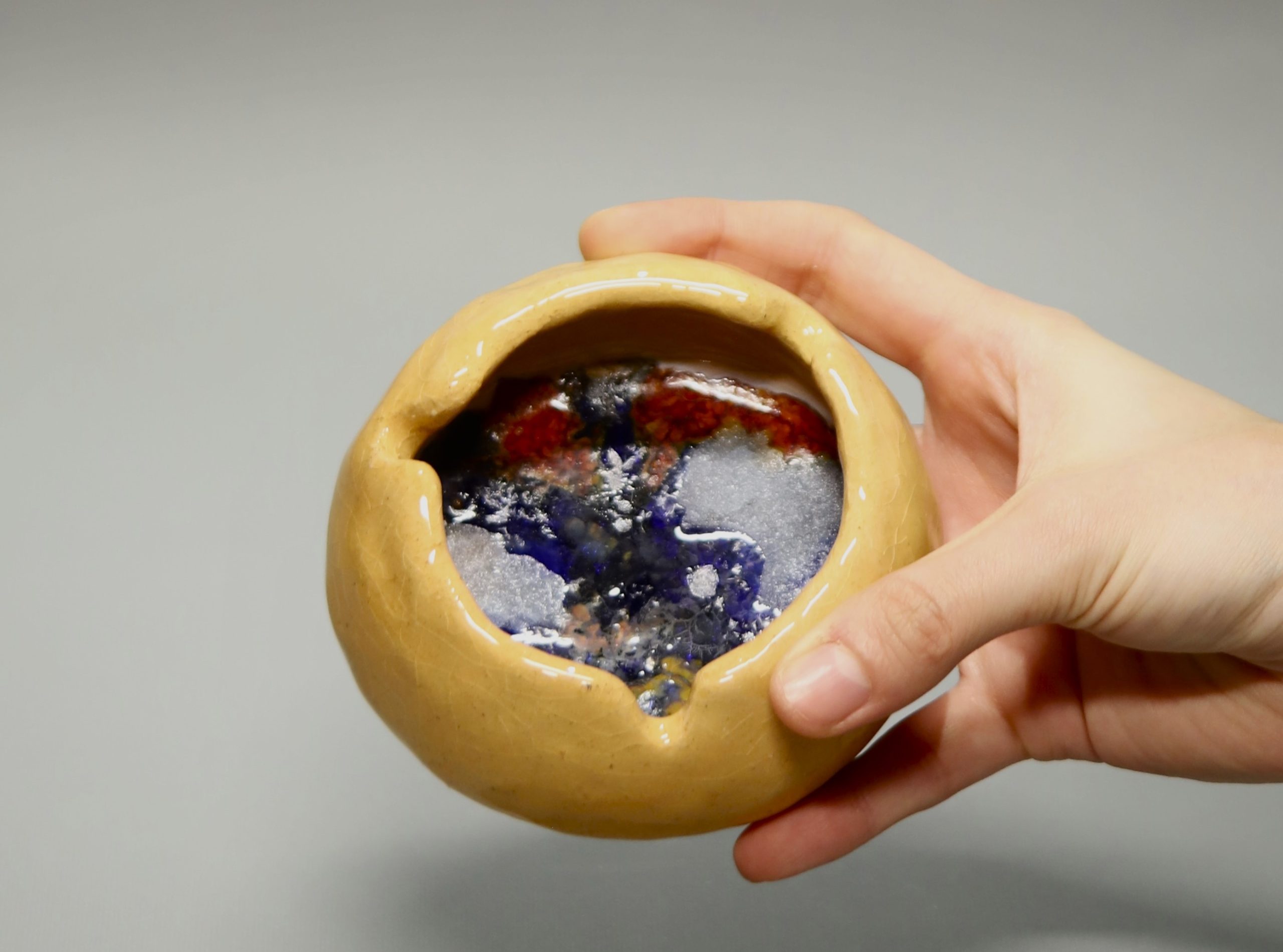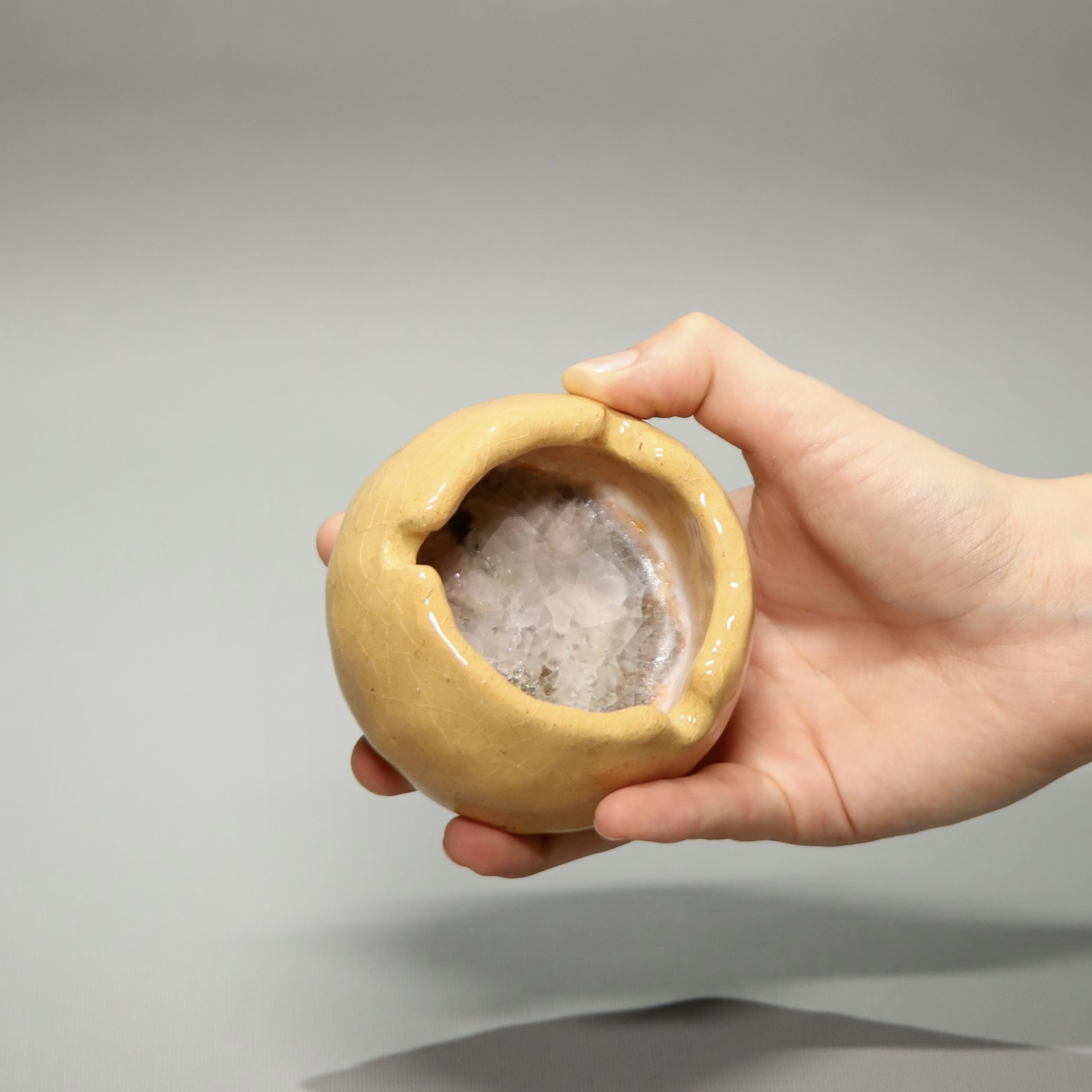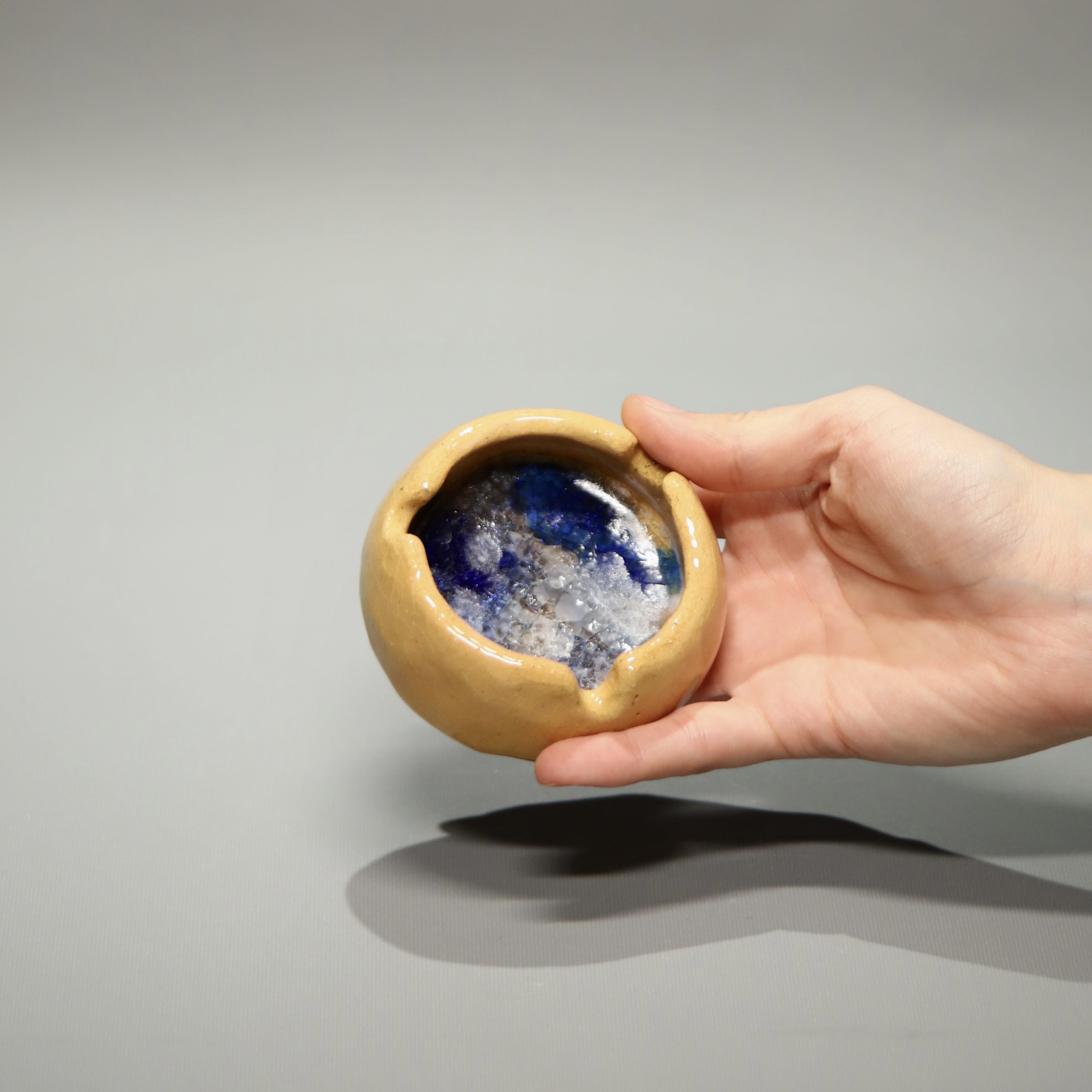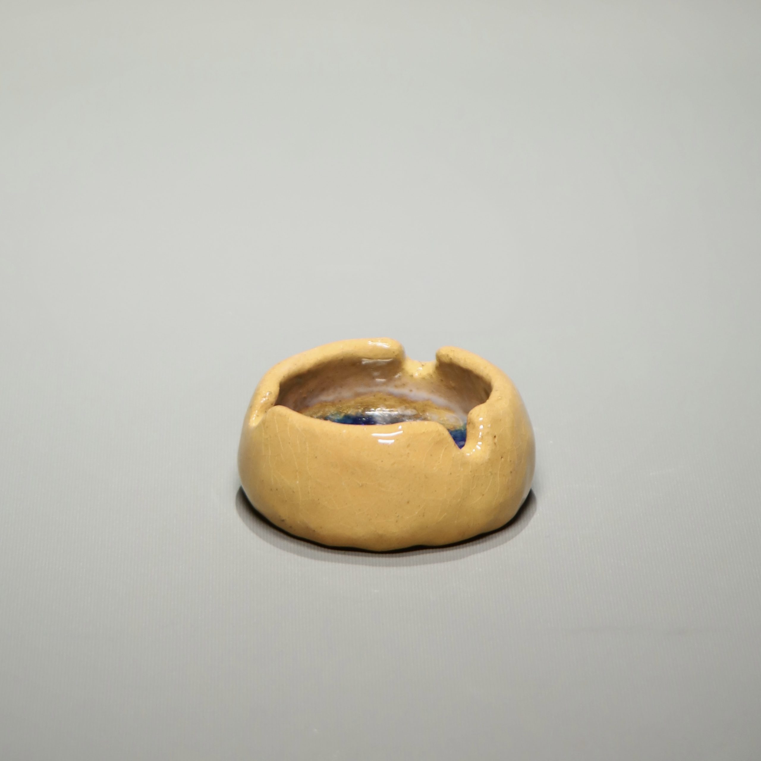 Ashtray series are produced entirely by hand . For the purpose of long-term use and cleaning convenience, they have taken their final form by being covered with transparent glaze and decored with colorful glass pieces.
